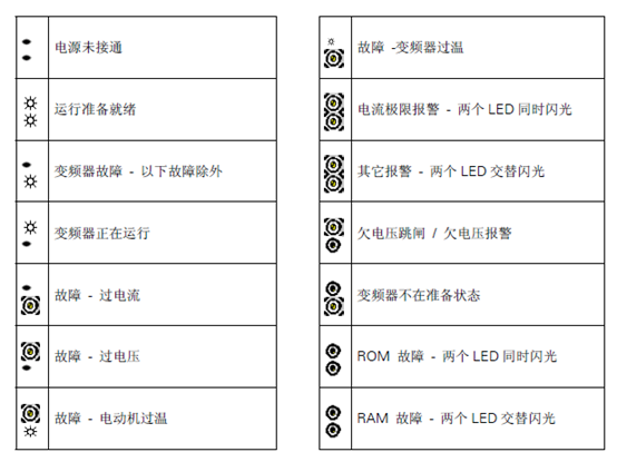 西門(mén)子變頻器的上,下兩個(gè)ALM指示燈有四種狀態(tài),分別是燈滅,長(zhǎng)亮,快速閃爍,和閃爍,分別代下以下含義: