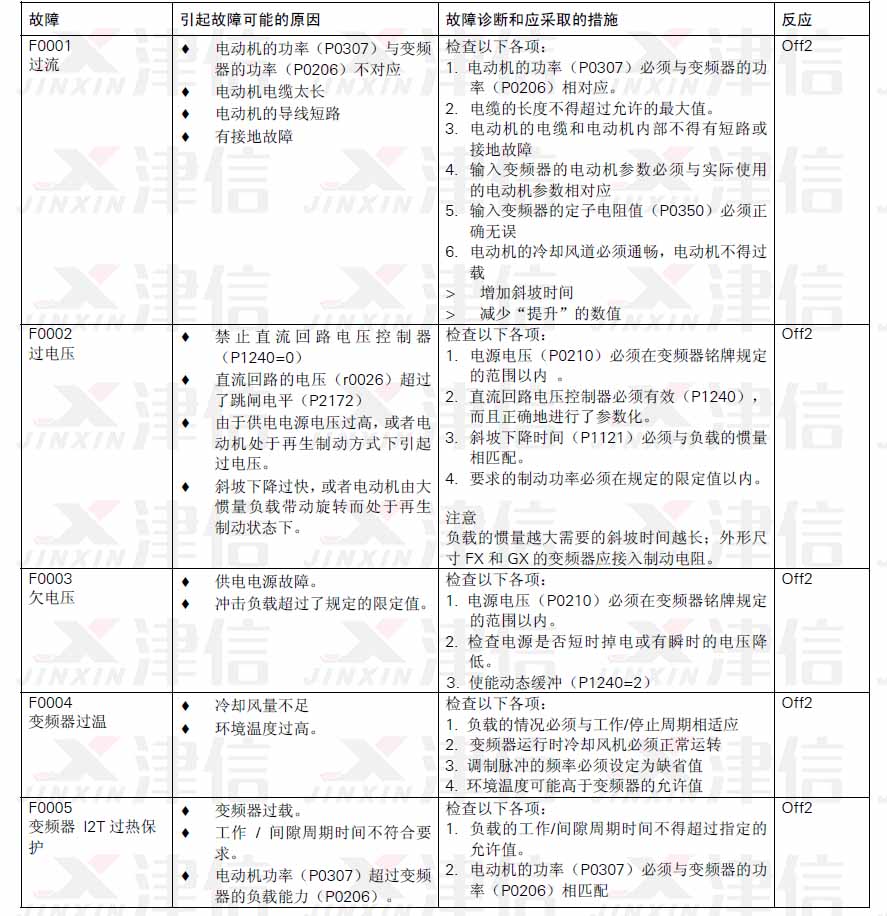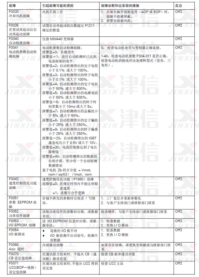 故障信息以故障碼序號(hào)的形式存放在參數(shù)R0947 中(例如,F(xiàn)0003=3)。相關(guān)的故障值可以在參數(shù)R0949 中查到,如果該故障沒(méi)有相關(guān)的故障值,R0949 中將輸入0。而且,可以讀出故障發(fā)生的時(shí)間(R0948)和存放在參數(shù)R0947 中的故障信息序號(hào)(P0952)。