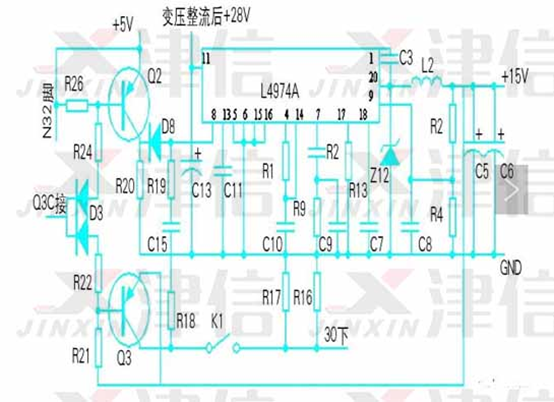 • 測試芯片L4974A 輸出電壓15V為0V,查芯片8腳軟啟動電壓是0.5V,正常值為3.85V,所以芯片L4974A的8腳輸入電壓不對。經查Q2輸入觸發電壓正常。