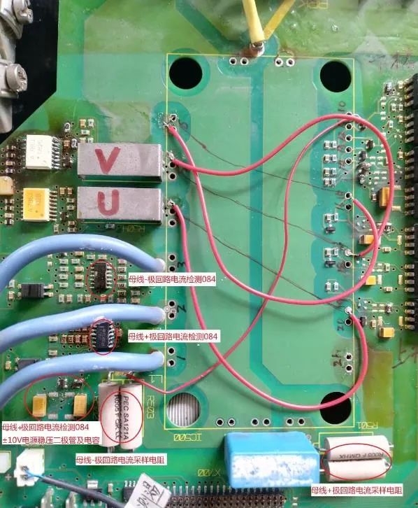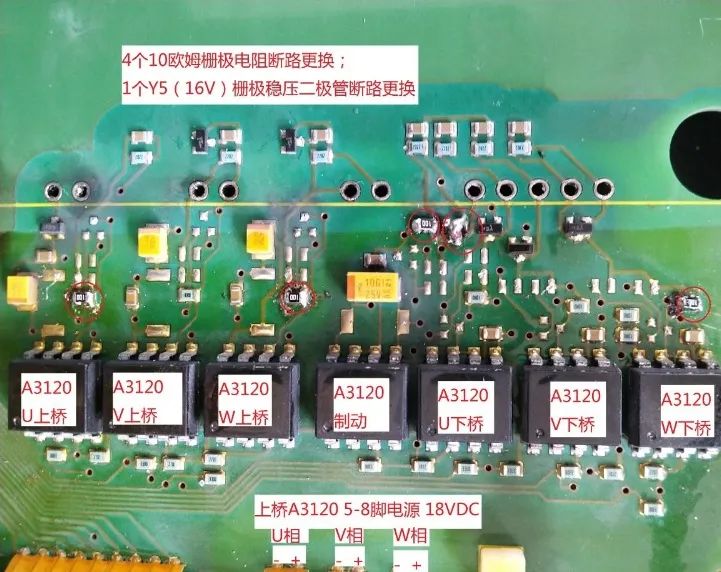 首先進行靜態檢測,發現下橋IGBT的U、W兩項短路。拆機后觀察驅動板, 發現驅動芯片HCNW3120周邊電路元件有明顯炸黑現象,尤其是U、W上橋和W下橋的G極回路電阻10歐姆發黑斷路,制動的G極回路電阻10歐姆發黑斷路、保護穩壓二極管Y5(16V)炸飛。