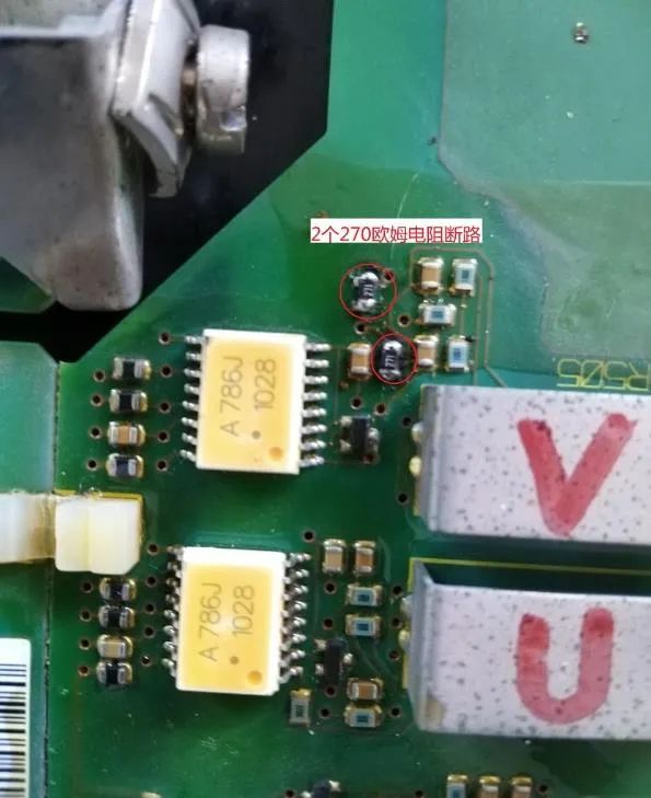 觀察U、V輸出電流檢測的2個芯片A786周圍電路元件,發現V相電流檢測A786附近有2個貼片電阻(270歐姆)發黑斷路;